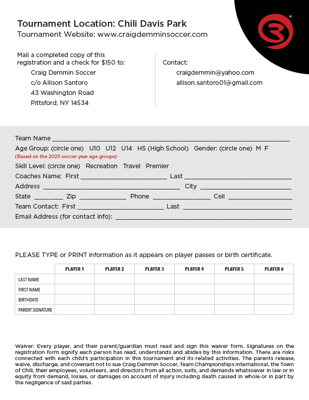 GENERAL: 3TC/Craig Demmin Soccer will not be responsible for any expenses incurred by any team due to the cancellation in part or whole of any Division or any part of this tournament.
